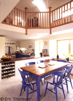 A former farmhouse and outbuildings were converted to provide a new home for a painter, a graphic designer and their children. The new kitchen and dining area are open to the graphic design studio, above. An adjacent byre is now a large painter's studio. Project completed 1999. |