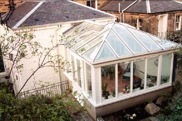 Planners required that this conservatory in Glasgow's West End Convservation Area should not extend above the eaves at the rear of this Victorian terrace. Neighbours were concerned about privacy and loss of light, so glazing on the boundary is etched and fire resistant. Completed in 1999. |